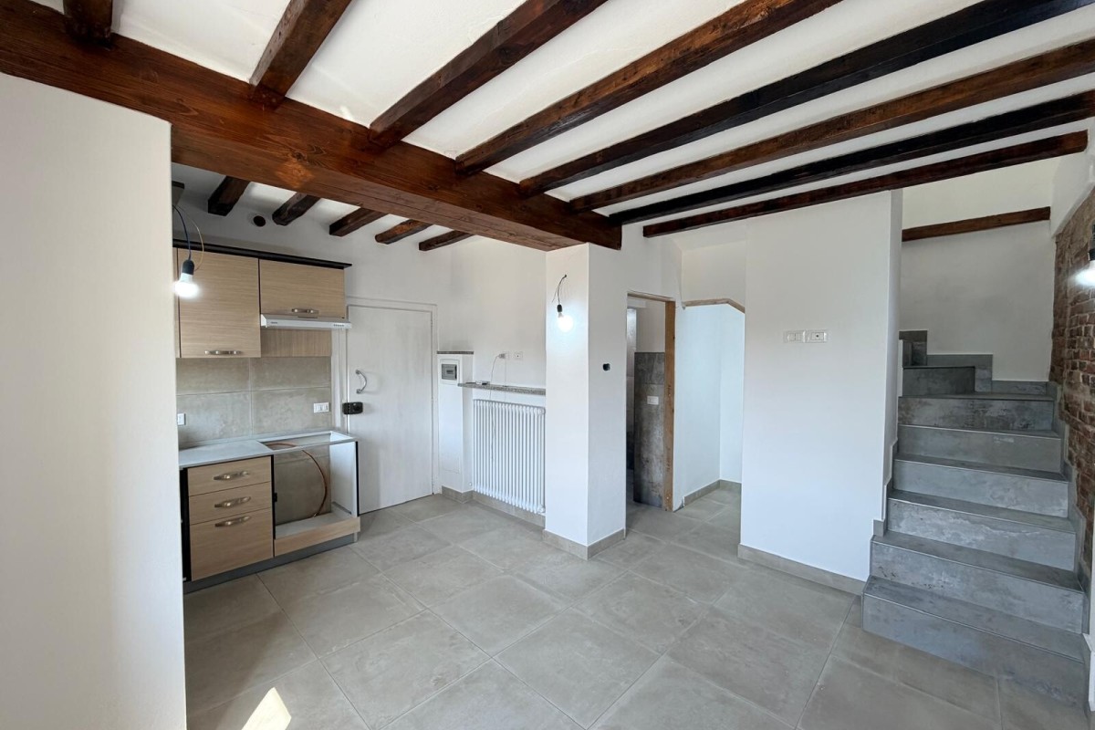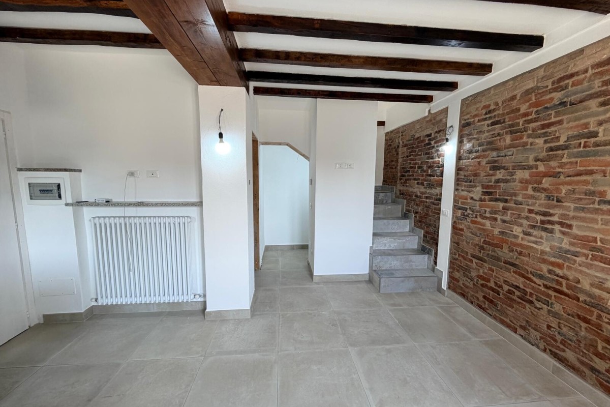 luminosa, con soggiorno e cucina a vista realizzata su misura. L’ambiente è impreziosito da travi a vista e da una caratteristica parete in mattoncini,