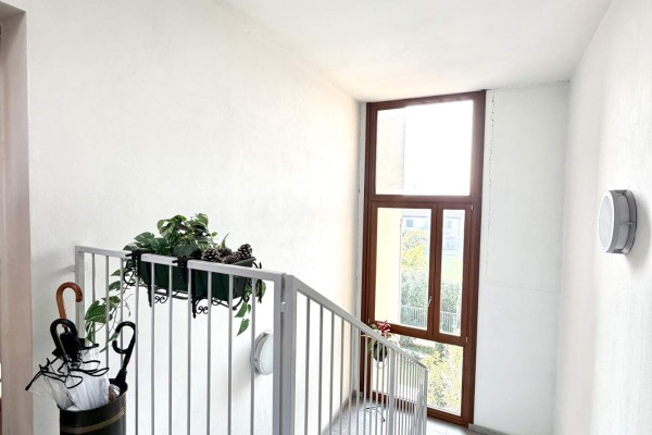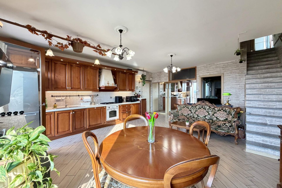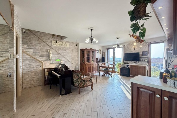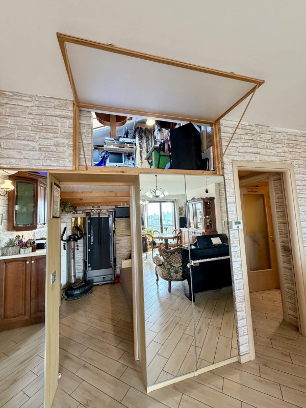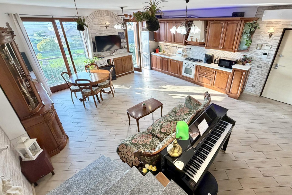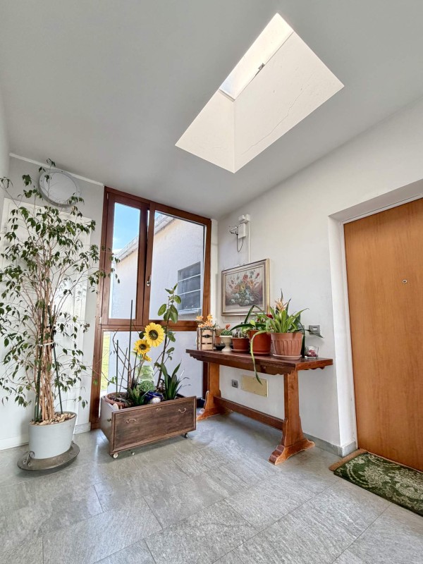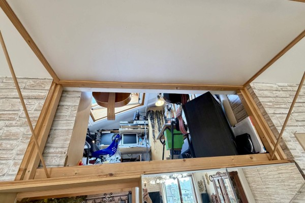 L’ingresso è nell’ampio soggiorno con cucina a vista che si presenta molto arioso e luminoso grazie alle due portefinestre con affaccio sul verde; sempre nel soggiorno, attualmente, nella parte adiacente il disimpegno della zona notte, si trova un locale hobby soppalcato.