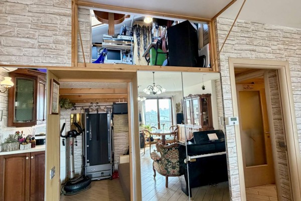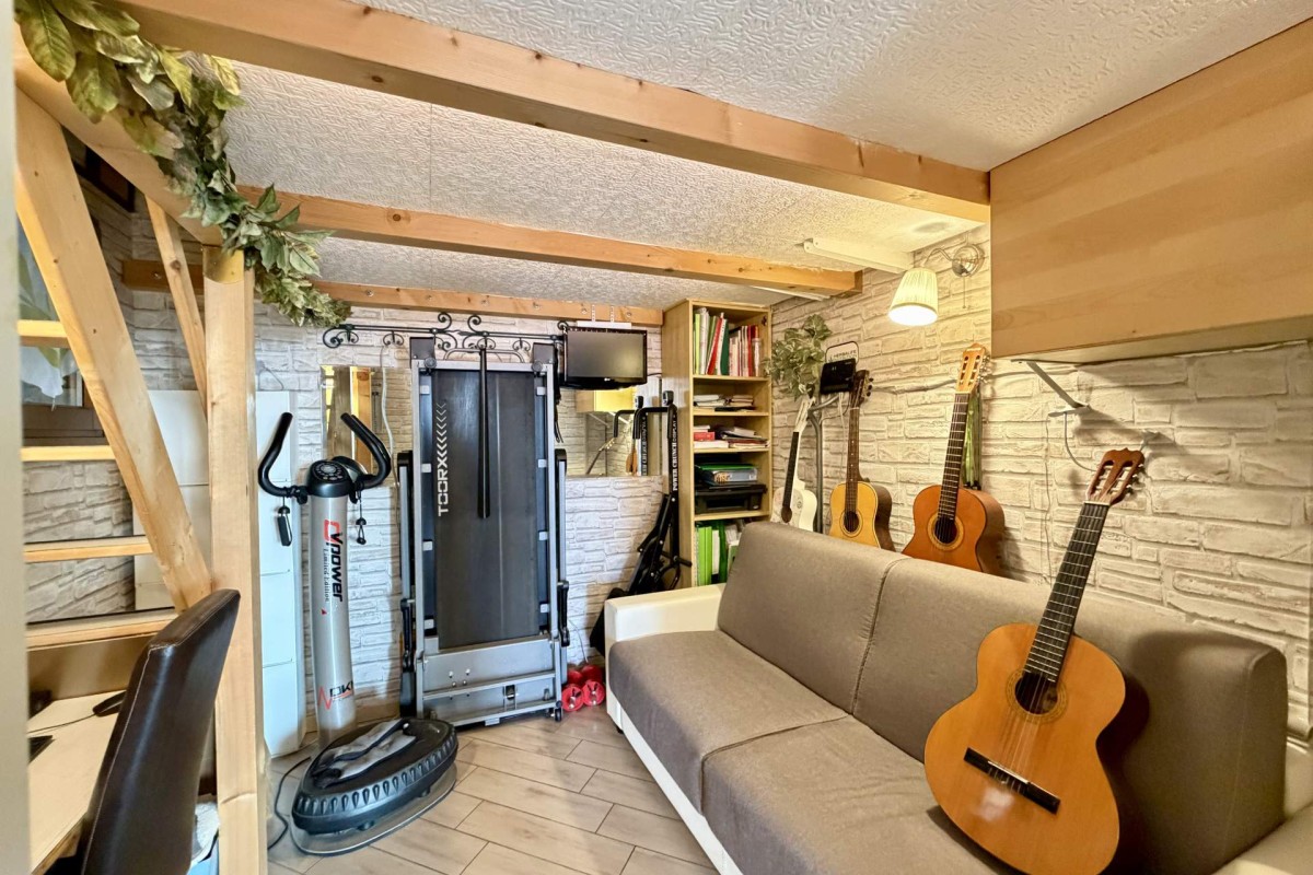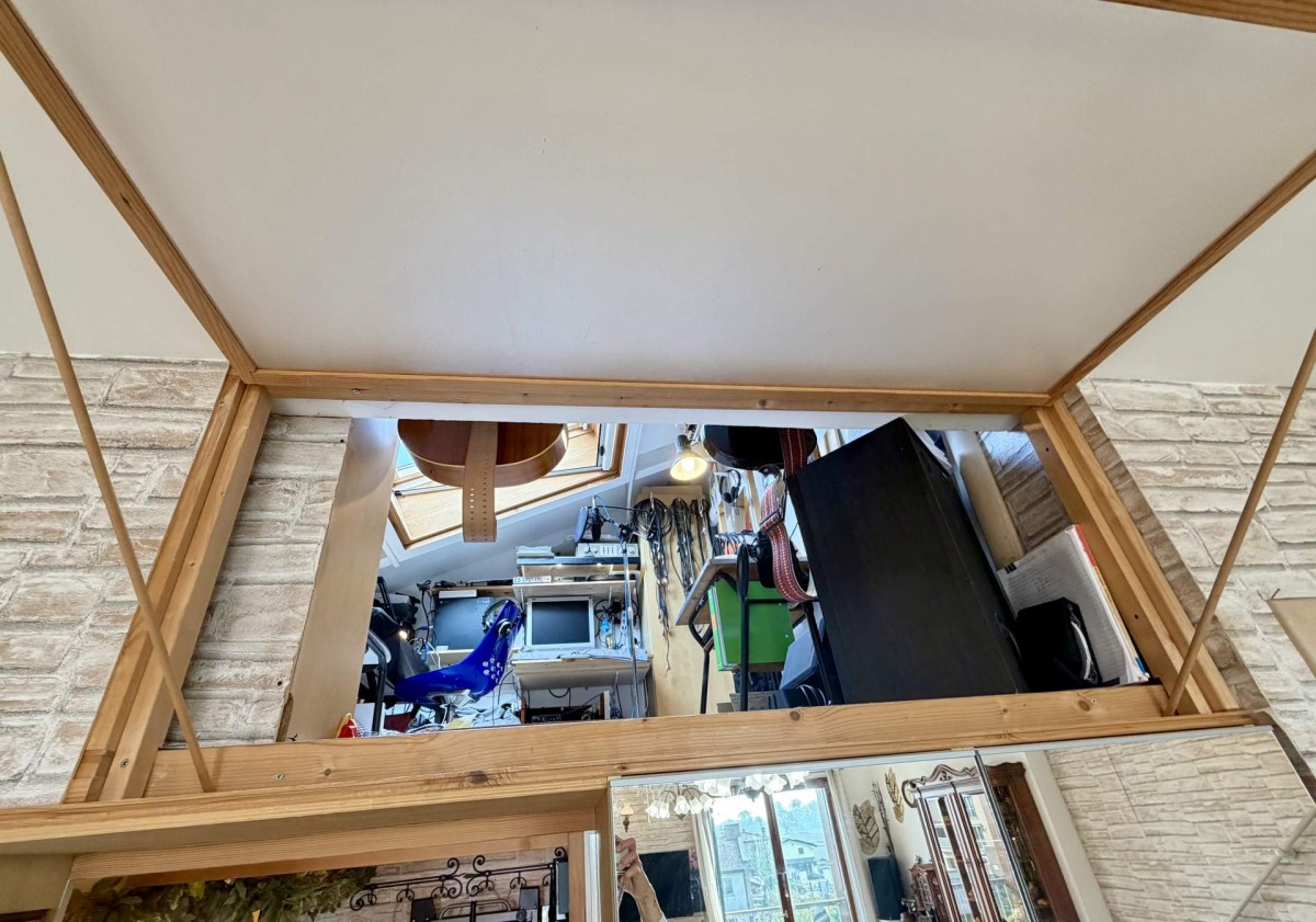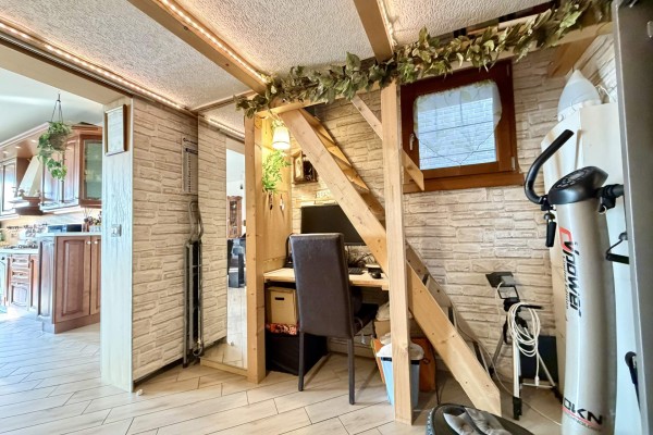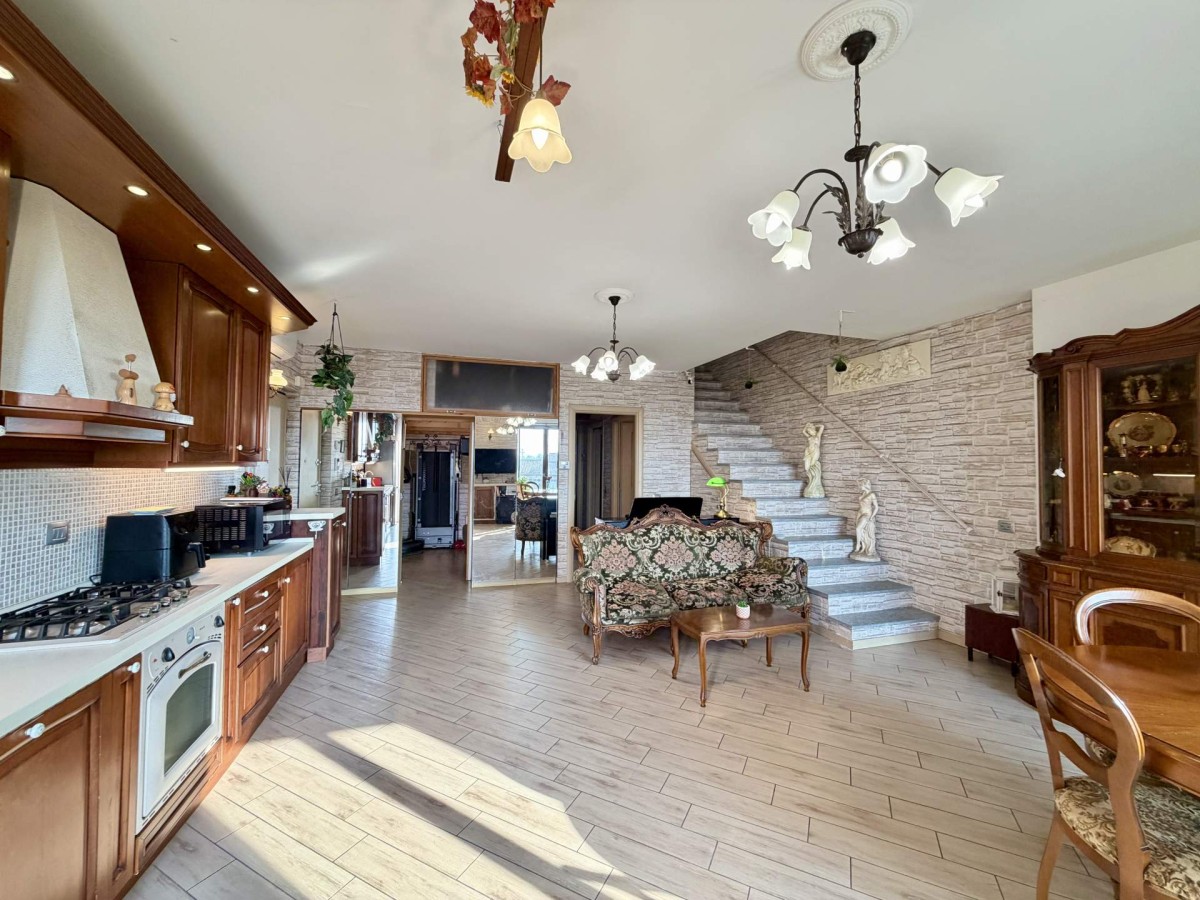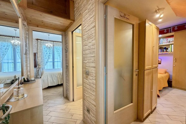 L’ingresso è nell’ampio soggiorno con cucina a vista che si presenta molto arioso e luminoso grazie alle due portefinestre con affaccio sul verde; sempre nel soggiorno, attualmente, nella parte adiacente il disimpegno della zona notte, si trova un locale hobby soppalcato.