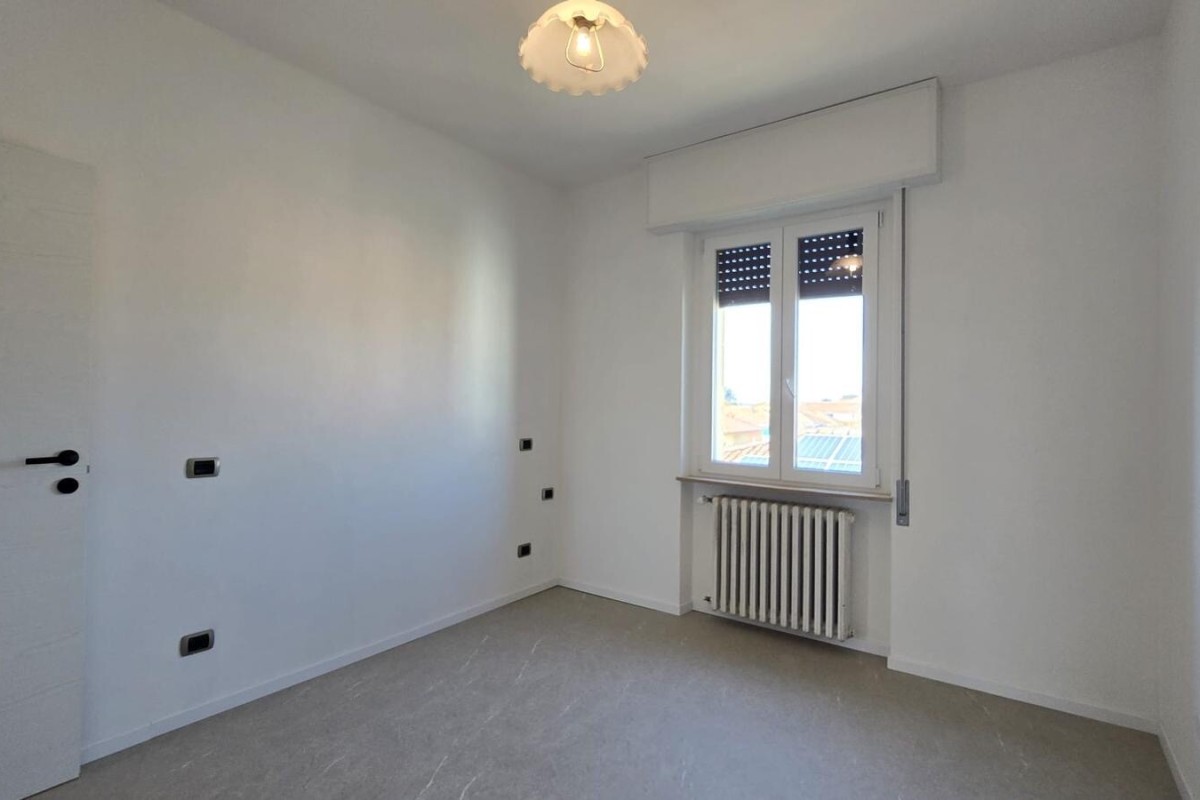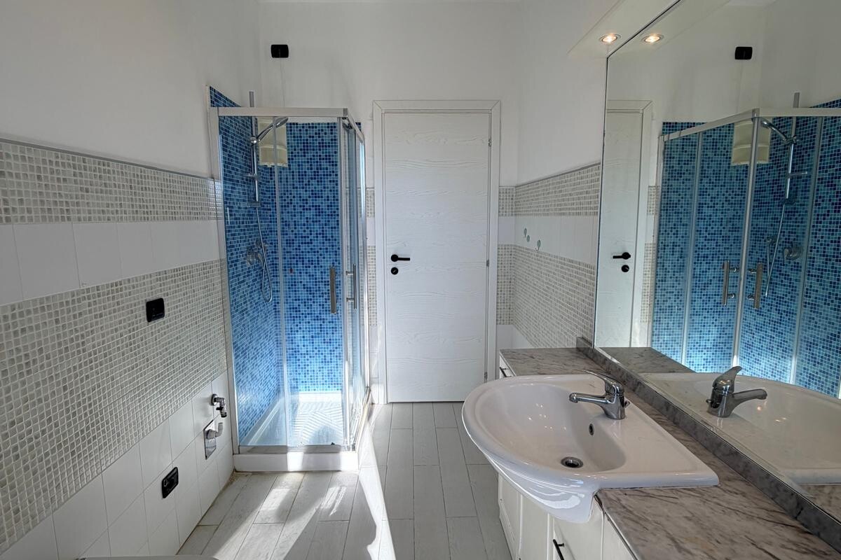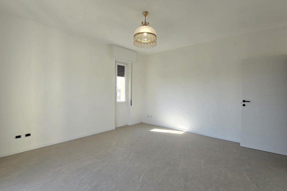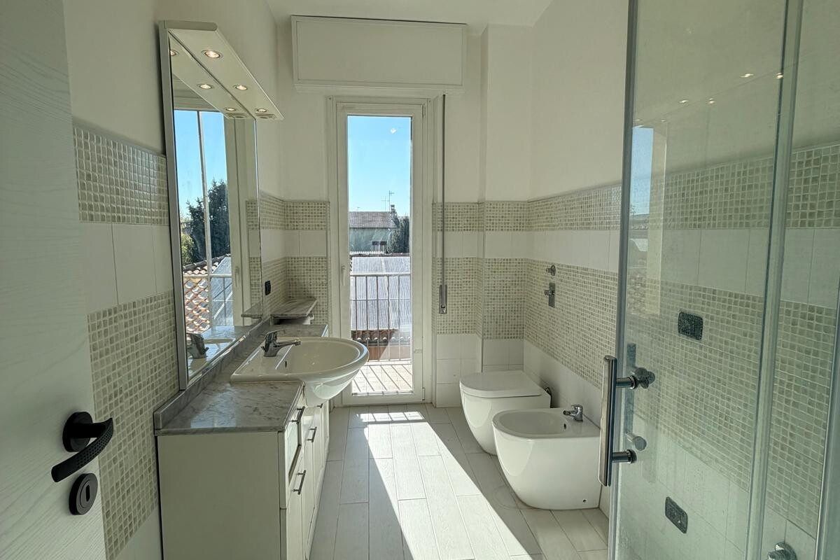 La zona notte comprende due camere da letto: una spaziosa matrimoniale, una camera singola di generose dimensioni ed un bagno moderno con doccia, attacco lavatrice, dotato di portafinestra con accesso diretto al secondo balcone.
