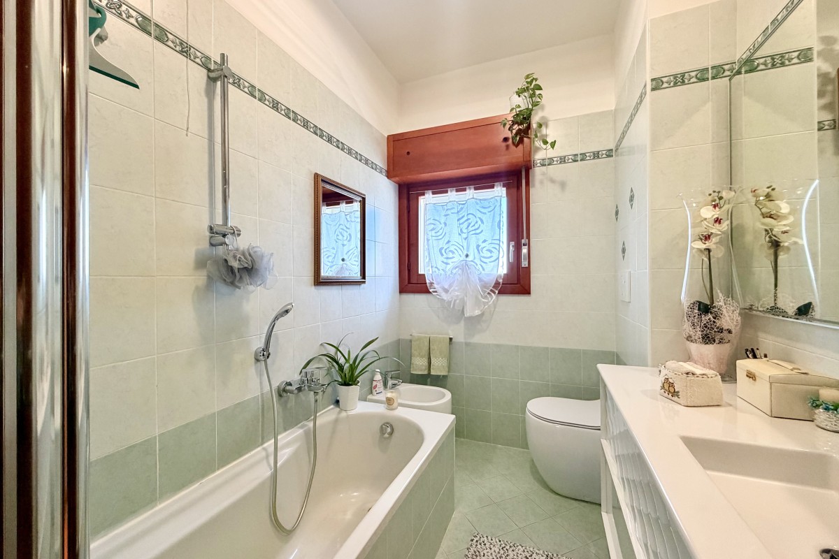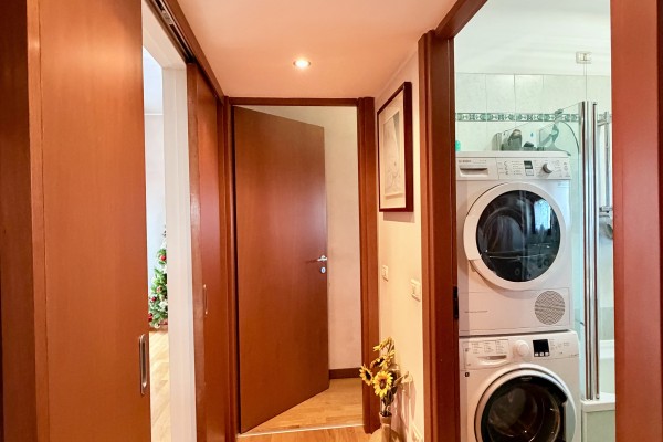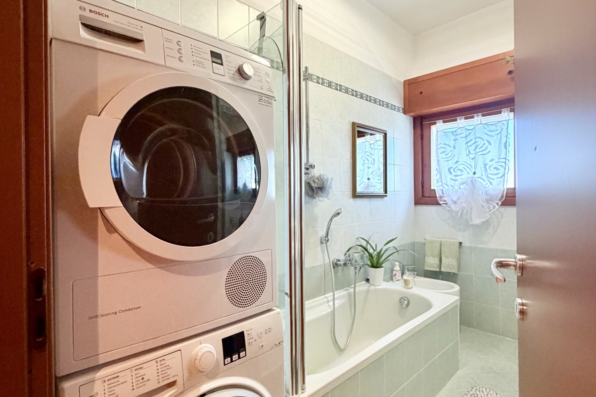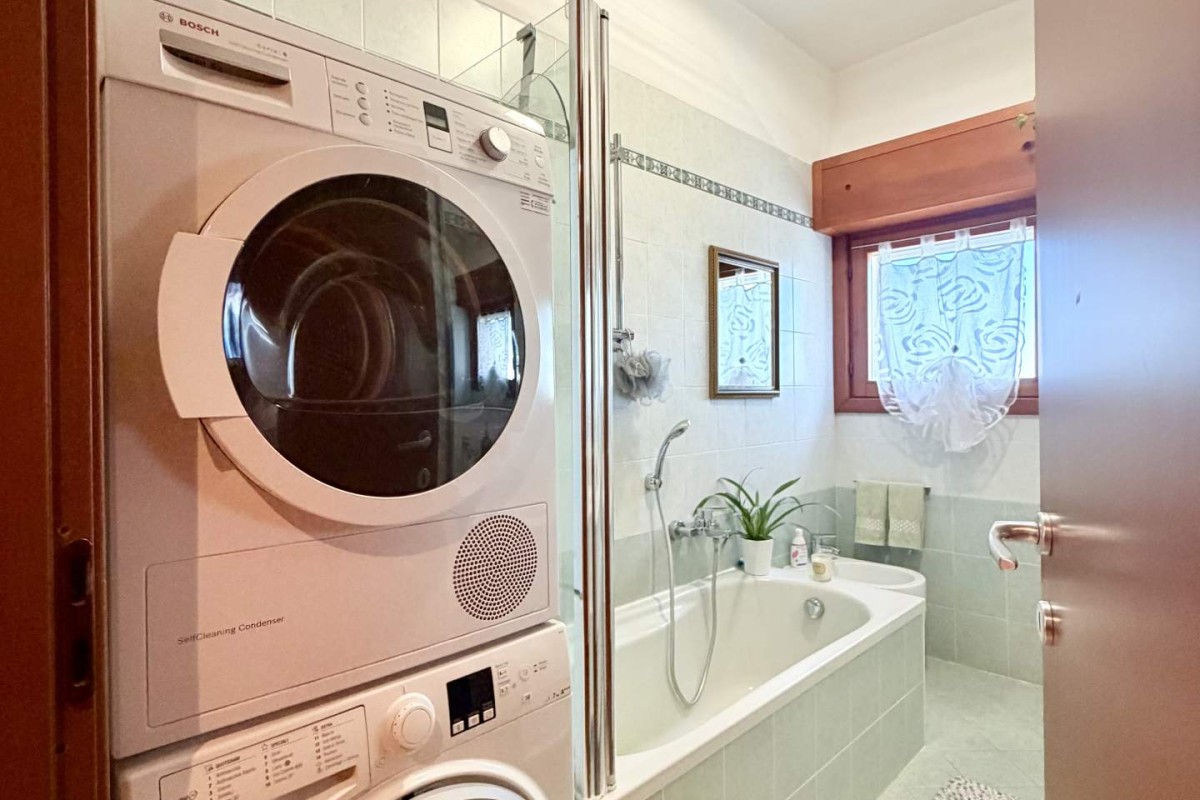 al grande bagno con vasca e vano per lavatrice e asciugatrice;