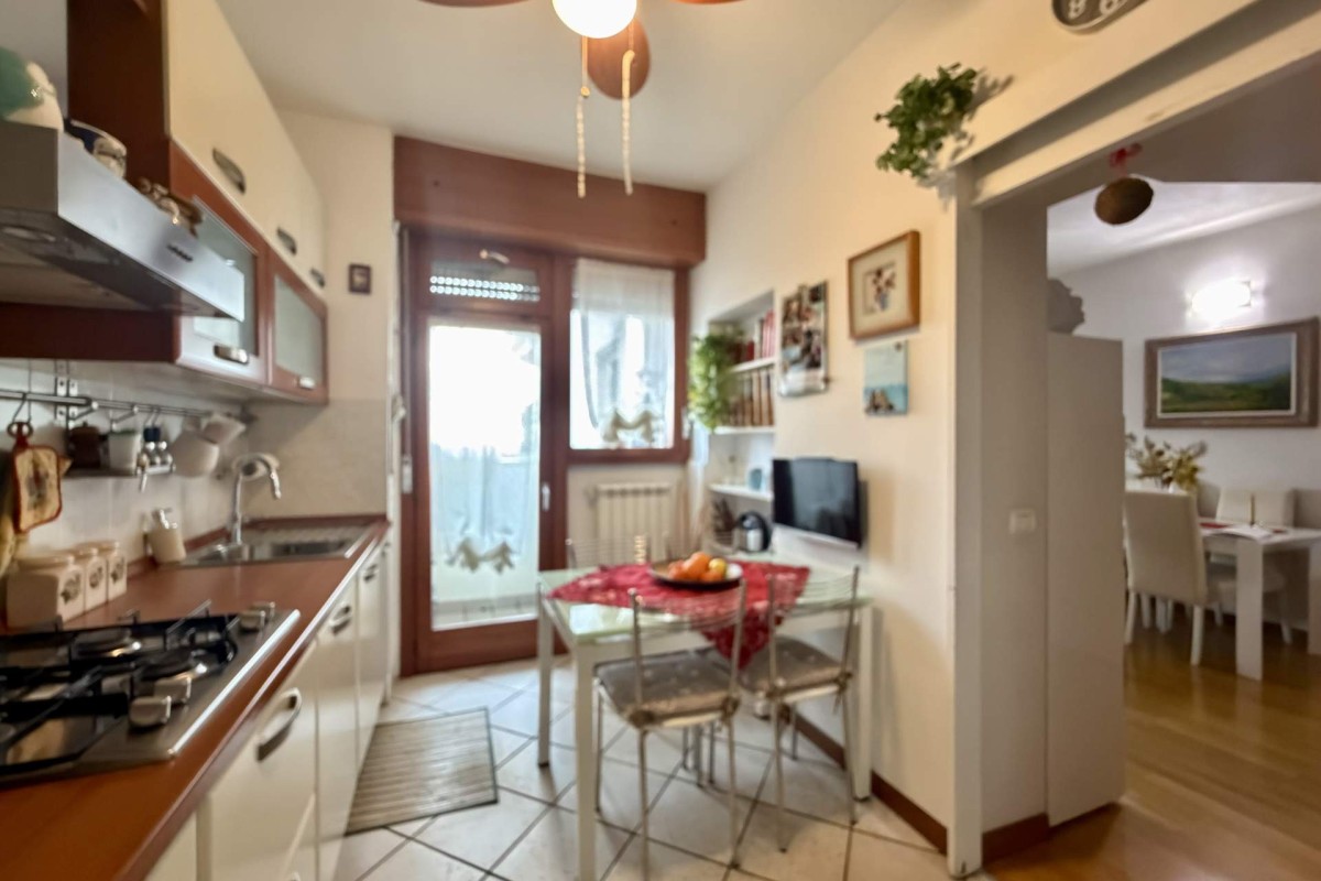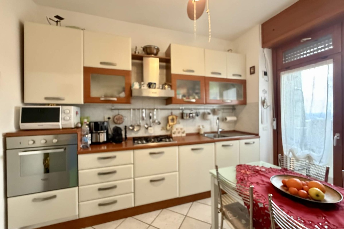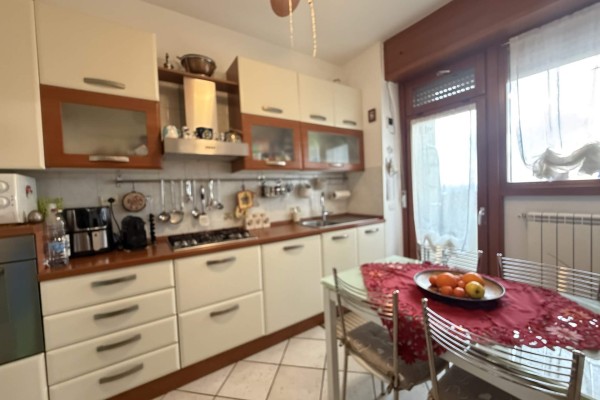 Alla destra della porta d’ingresso troviamo un comodo ripostiglio, sulla sinistra la cucina,