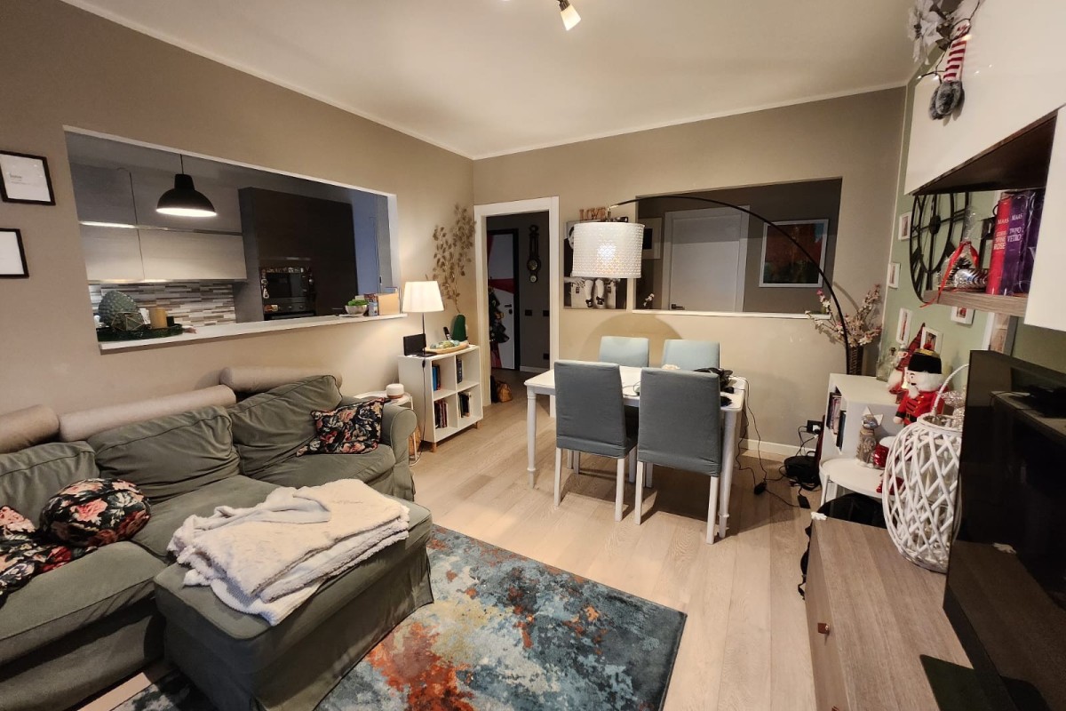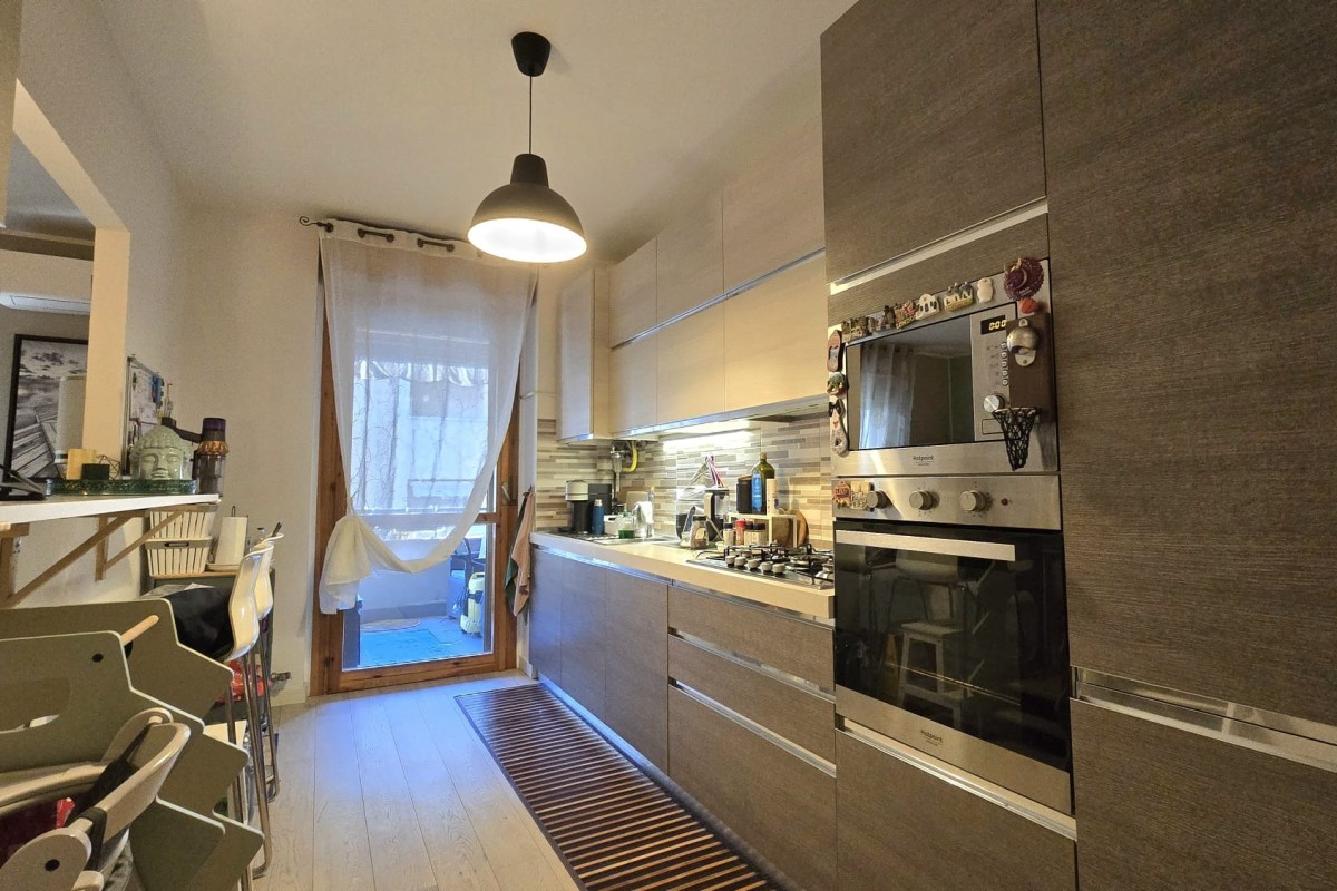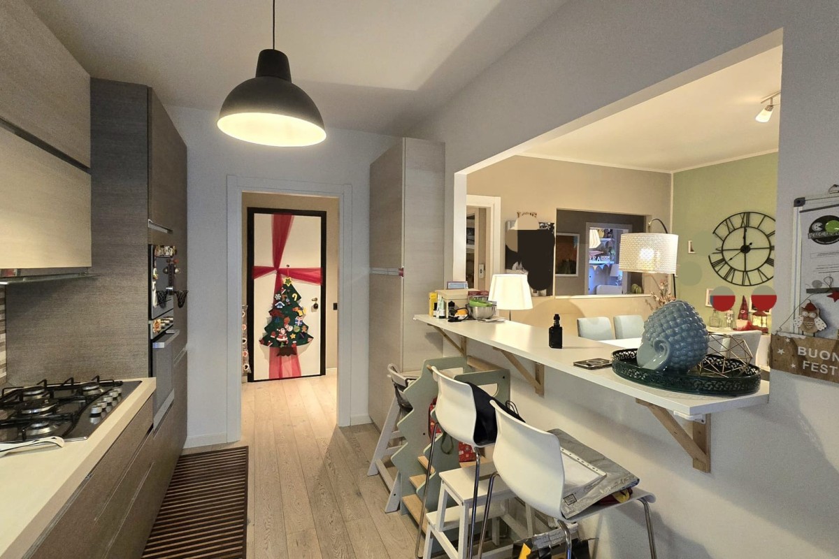 La zona giorno, si apre su un ambiente living moderno e accogliente. La cucina, parzialmente separata, dialoga armoniosamente con il soggiorno grazie a un’apertura strategica che offre continuità visiva. Qui trova spazio un comodo bancone conviviale, ideale per colazioni veloci o aperitivi con gli amici, che permette di vivere la cucina restando connessi con la zona relax/TV.