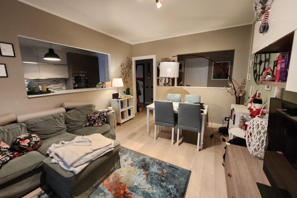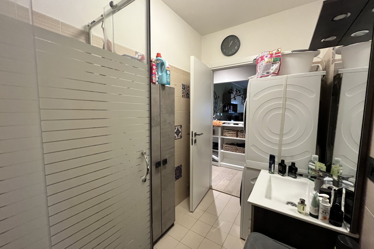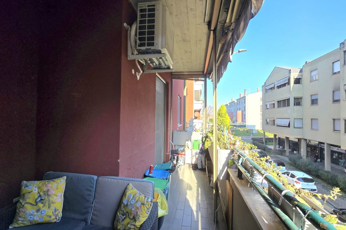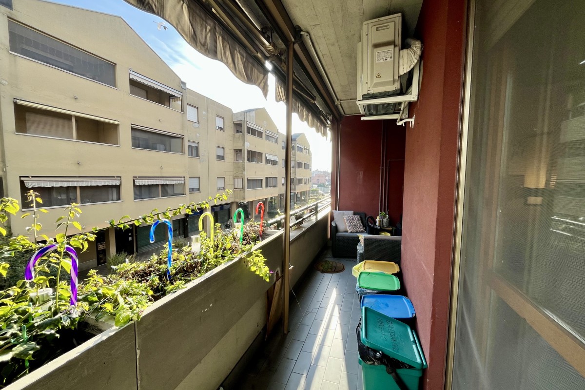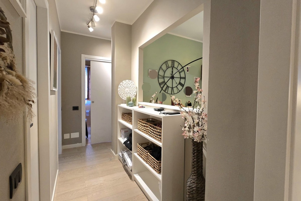 La luce naturale è protagonista: entrambi gli ambienti affacciano sul balcone loggiato, un vero e proprio "salotto all'aperto" riservato e fruibile, già dotato di tende da sole, perfetto per rilassarsi nella massima privacy. A completare l'ingresso, un praticissimo ripostiglio scaffalato sulla sinistra aiuta a mantenere l'ordine in casa.